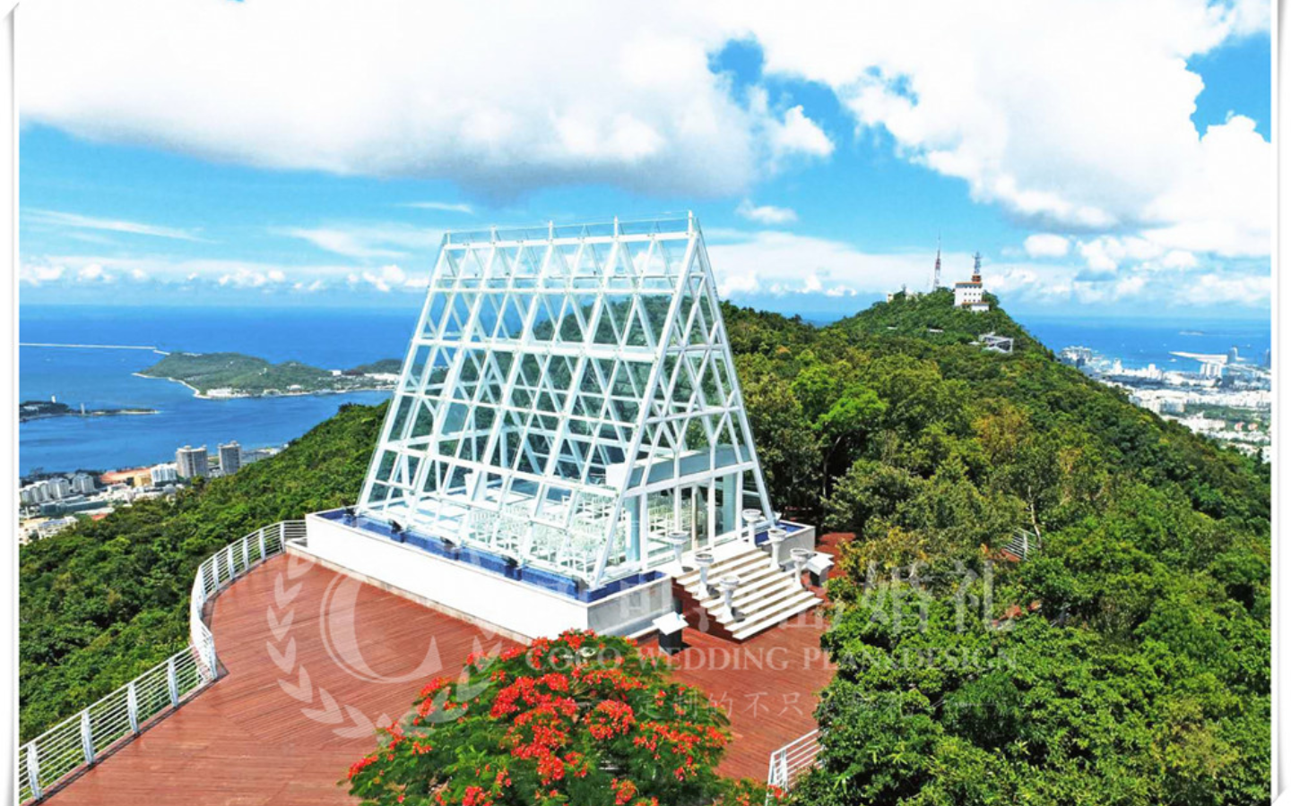 三亚凤凰岭海誓山盟是三亚城市中心的最高峰,唯一可以全览三亚四大海湾(三亚湾、大小东海、榆林湾、亚龙湾)及360°鸟瞰三亚整座城市全貌的最佳位置。水晶教堂位于凤凰岭之上,有着最高的地域可以俯瞰整个三亚地区的景观,在哪里你不仅可以看到最美的景色,还能亲自踏入那座教堂,走进殿堂,采用的是三角的设计,四面通透的透明玻璃组成,透明的玻璃外墙,大面积的落地玻璃,整体通透,360度山海景色观赏,走到这里你会体会前所未有的感受,穿上那条圣洁的婚纱,走入殿堂,挽着心爱的爱人一起记录这个美丽又浪漫的镜头。